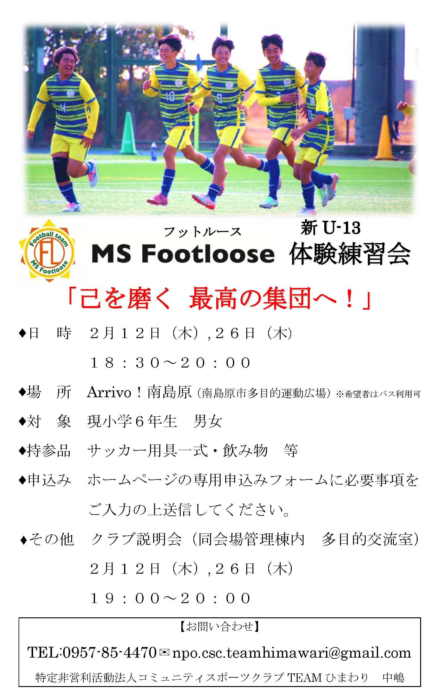 フットルース 新U-13体験練習会のご案内(2026.02.12、26開催) 2026-02-05 最終更新日時 : 2026-02-05 MinaMi-shiMabara111 お申込みフォーム 必須お名前ふりがな 必須生年月日 —以下から選択してください—197019711972197319741975197619771978197919801981198219831984198519861987198819891990199119921993199419951996199719981999200020012002200320042005200620072008200920102011201220132014201520162017201820192020202120222023年—以下から選択してください—010203040506070809101112月—以下から選択してください—01020304050607080910111213141516171819202122232425262728293031日 必須年齢 必須保護者の名前 必須続柄 必須住所 必須電話番号 必須メールアドレス 必須体験会参加日 2/12(木)だけ参加2/26(木)だけ参加2日間とも参加 必須クラブ説明会への参加 2/12(木)だけ参加2/26(木)だけ参加2日間とも参加参加しない 必須送迎について 各自送迎送迎バス利用 任意【送迎希望者のみ】乗降バス停名 任意現在所属しているチーム 任意その他 必須個人情報保護方針への同意 はいいいえ ■個人情報保護方針への同意 申込の際にご入力・ご提出いただく個人情報は、「TEAMひまわり」がクラブの運営及び 今後の各種教室、イベント等の案内の為にのみ、管理利用し原則として申込者の許可なく第三者へ提供いたしません。 細心の注意を払い保護および管理いたします。 また、教室等の模様(写真等)をクラブ広報誌等の資料として使わせていただくことがございます。 ご入力した内容にお間違えなければ、こちらにチェックを入れてから送信ボタンを押してください。